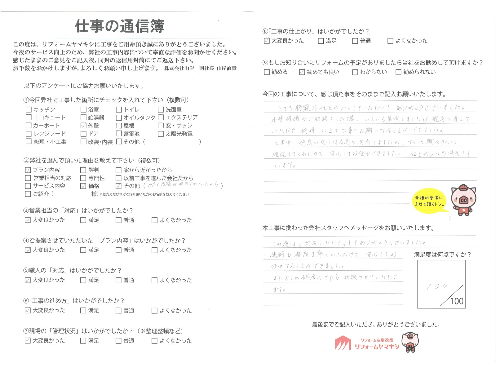 とてもきれいな仕上がりにして頂いてありがとうございました。 外壁修繕の相談をした際、いろいろ質もしましたが親身に答えて頂き、納得した上で工事をお願いすることが出来ました。 工事中、何度か気になる点を共有しましたが、すぐに勅任さんに確認してくれたので安心してお任せすることが出来ました。 仕上がりにも満足しています。 又どこか不具合が出たら相談させていただきます。