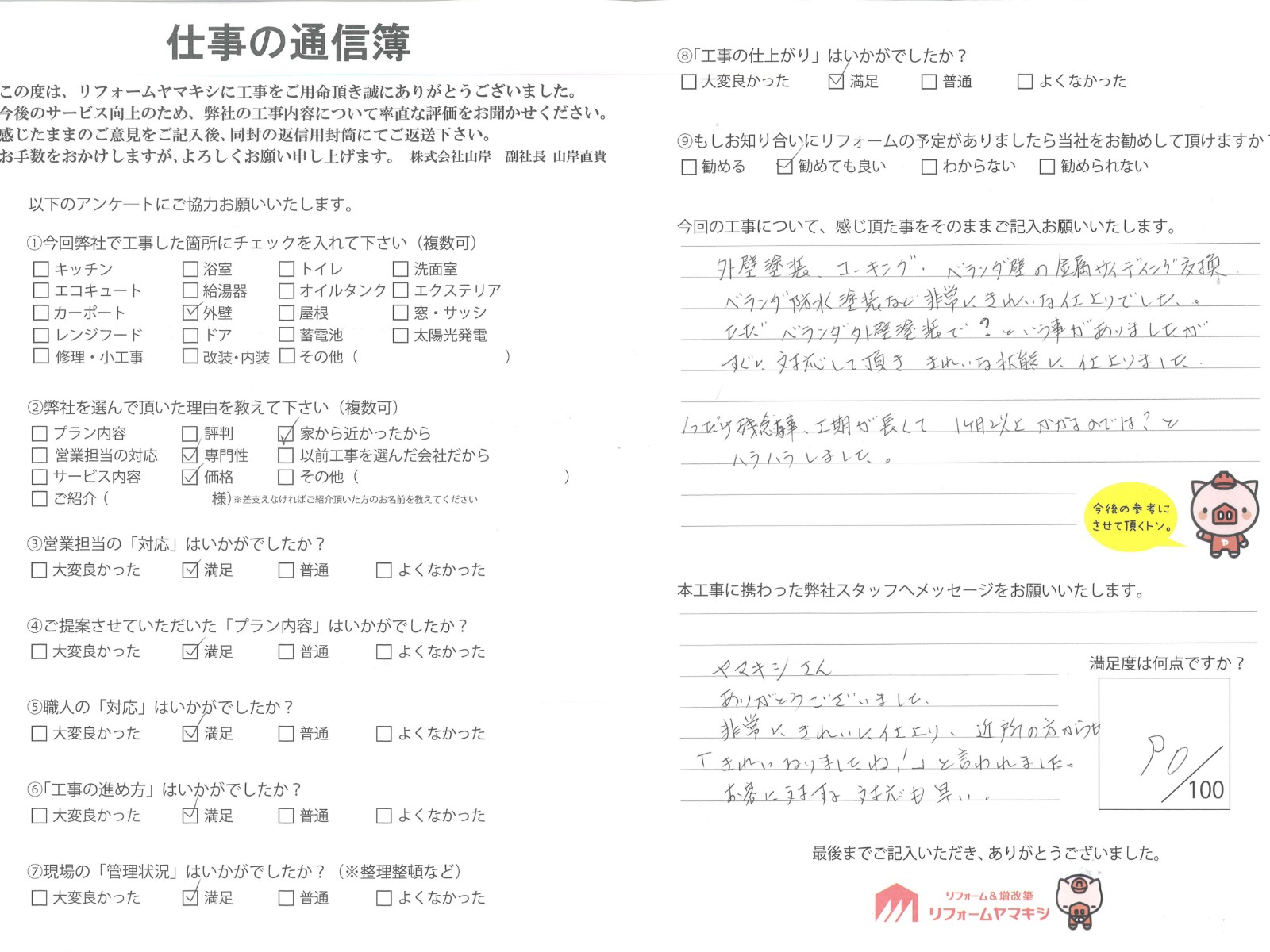近所の方からも「きれいになりましたね!」と言われました! 外壁塗装、コーティング、ベランダ壁金属サイディング交換、ベランダ防水塗装など非常にきれいな仕上がりました。